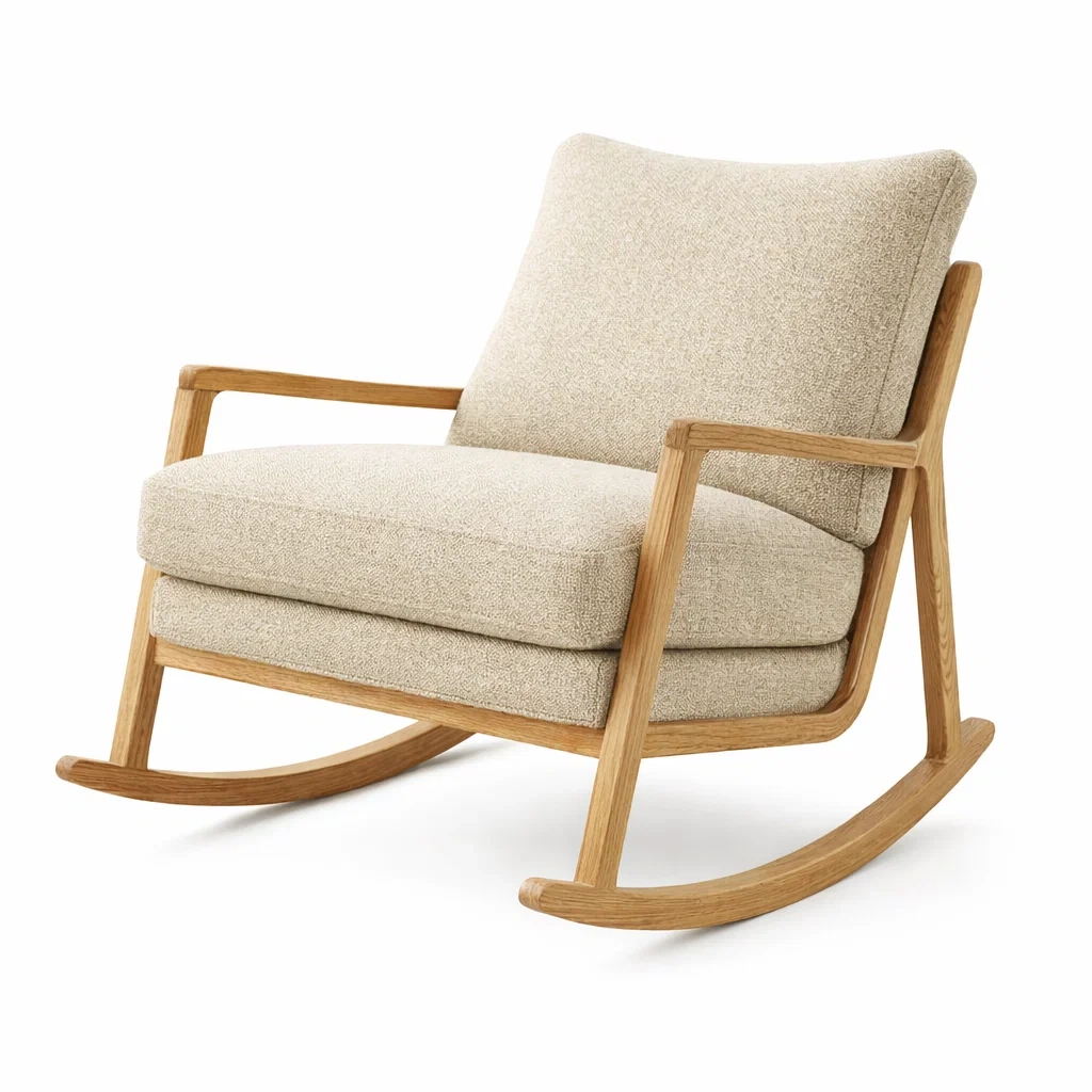 Sedia a dondolo in Legno di Quercia e Tessuto Bouclé